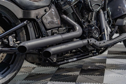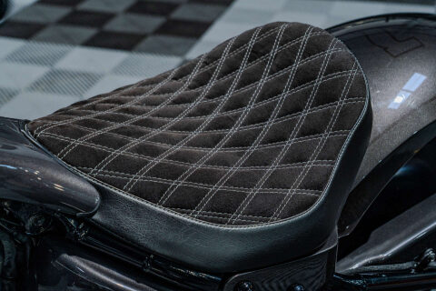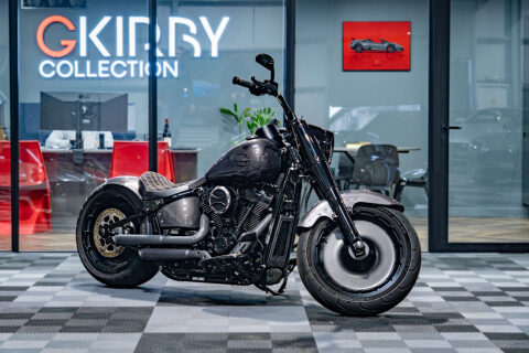 This Awesome one of kind Customised Fat Boy 114, Custom Grey Paint Finish, Gold Plated Lower Headers, Gold Plated Push Rod Covers, Gloss Black Tappet Covers, Air Ride Suspension, Custom Rear Fender, Micro LED Indicators Front and Rear, Custom Handle Bars, Powder Coated Wheels Finished in Black, Stage 1 Tune, Performance Exhaust System, Heavy Breather Air Filter, Gloss Black Cam Cover, Gloss Black Clutch Case, Custom Made Seat Finished in Suede with diamond Stitching, Black Gloss Primary Case with Gold Plated Primary Cover, Gold Plated Risers, Custom Black Dash