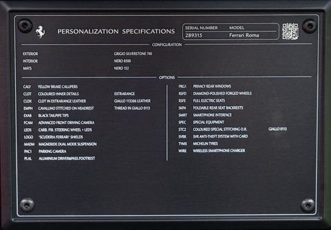 Grigio Silverstone, Nero Leather, Coloured Inner Details - Extra Range, CLOT In Extra Range Leather - Giallo Leather, Coloured Special Stitching In Giallo, Cavallino Stitched On Headrest In Giallo, Magnaride Dual Mode Suspension, Diamond Polished Wheels, Yellow Brake Calipers, Scuderia Ferrari Shields, Advanced Front Driving Camera, Black Exhaust Tips, Parking Camera, Privacy Glass, Fully Electric Seats, Foldable Rear Seat Backrests, Carbon Fibre Steering Wheel WIth LEDs, Aluminium Driver and Passenger Footrest, Smart Phone Interface, Wireless Charging, SVR ANti-Theft System, Full Ferrari Service History With Remainder Of The 7 Year Sevice Package, Ferrari Warranty Until 2026